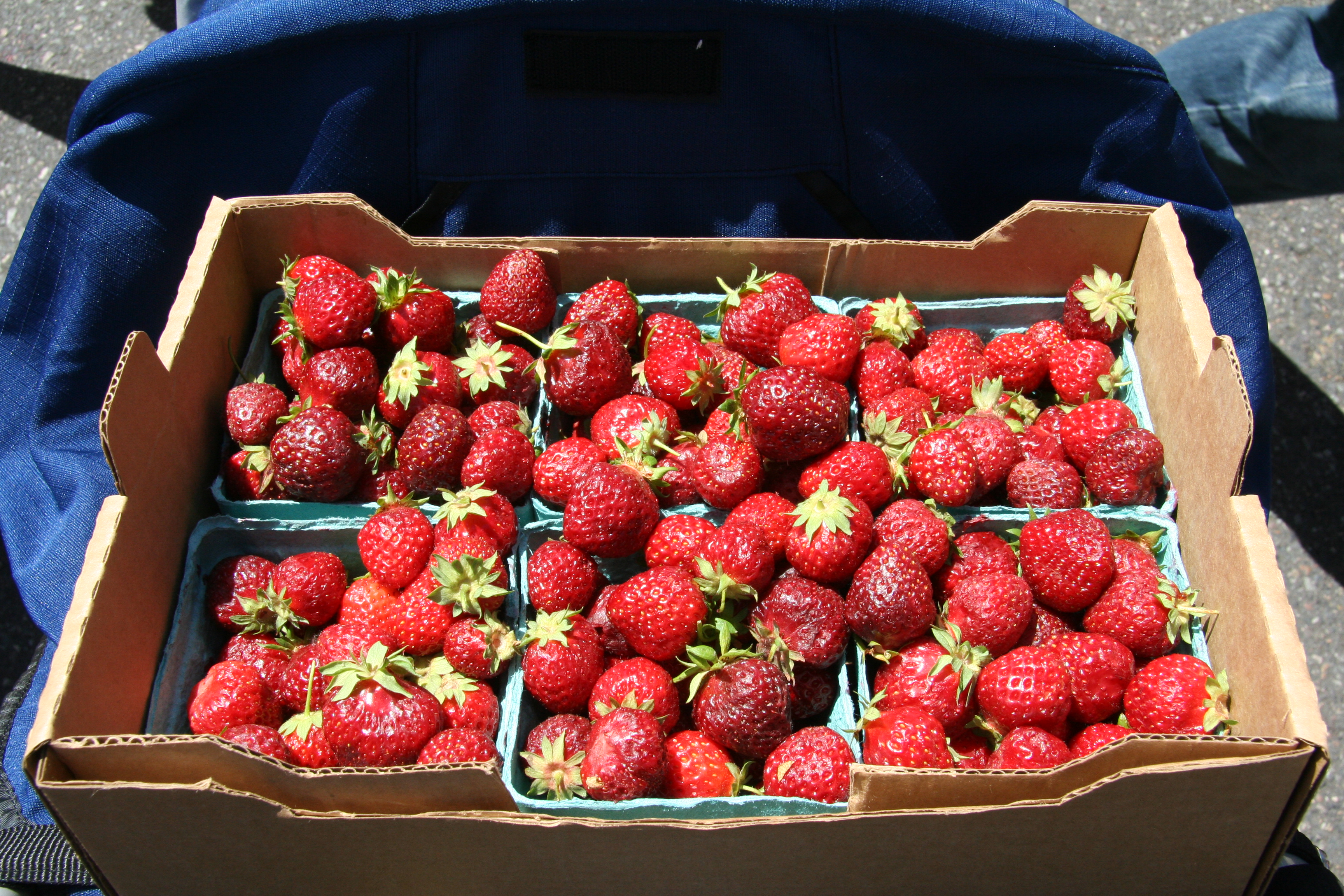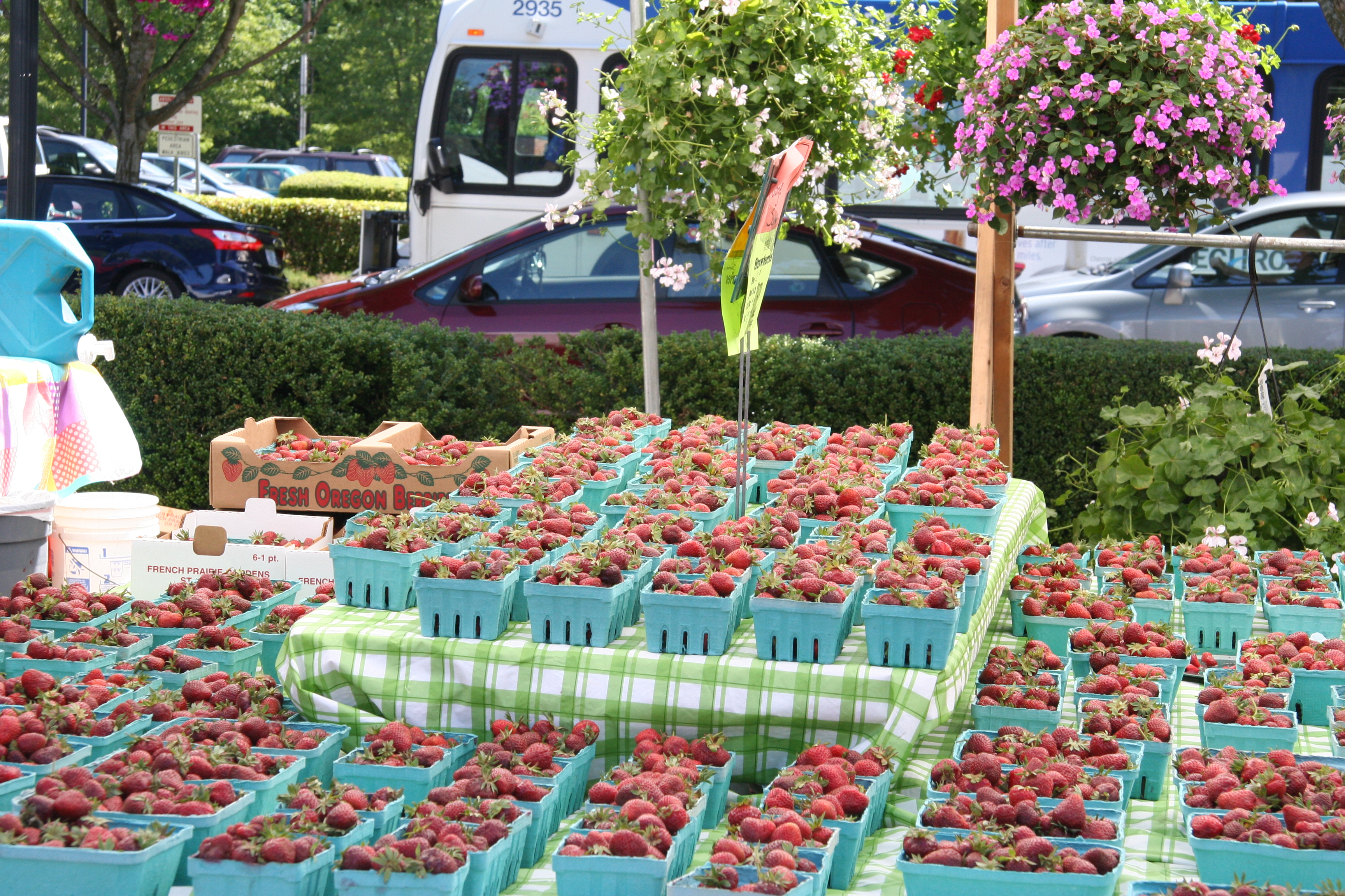 Last weekend we spent one of our little mini Mt. Hood-getaway days cruising the “Fruit Loop.” No, this isn’t a drive sponsored by Kellogg’s (probably because no one has clued them in yet); rather it’s a named loop around the Hood River area that’s packed with berry (and lavender) farms and fruit stands. And, on a clear day – which it was – it’s all set against the lovely backdrop of Mt. Hood. The fruit loop was pretty cool, except that I must say that once again, as someone who grew up amongst farms, fresh fruits stands and parking lots full of stacks and stacks of shipping crates for fruits right off the vine/tree/whatever, it was somewhat familiar territory to me (minus the Mt. Hood backdrop and plus a typically thick layer of smog that blocks the otherwise very pretty Sierra Nevada mountain range that overlooks the valley). That’s all a long way of saying that we were able to buy some Hood River strawberries last weekend, which we all happily gobbled up during the week. So the mission for this weekend: procure as many additional strawberries as possible before they were gone. The target: The Beaverton Farmer’s Market, of course.