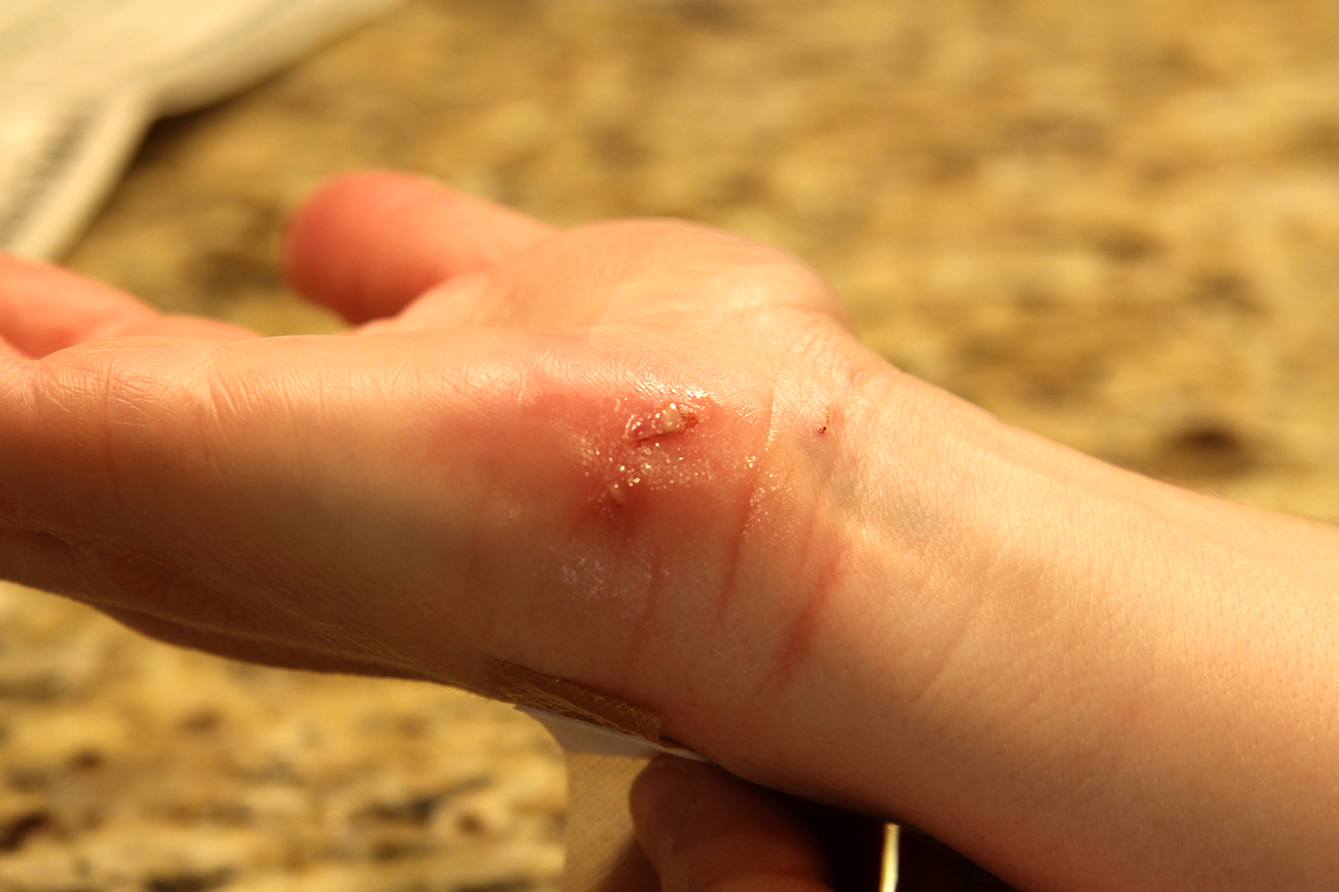 Anyway, I don’t mind saying that he got me pretty well because the ole’ hand isn’t feeling so hot today. That’s code for: it really hurts. It’s on the lower palm of my right hand, so use is a bit limited, including writing and typing. Bummer. I did pick up some hydrogen peroxide at the store this afternoon along with some normal Band Aids, so I’m hoping that it feels a bit less sore by tomorrow. I had Jeff take a picture earlier this evening just to prove I’m not telling any tall tales.