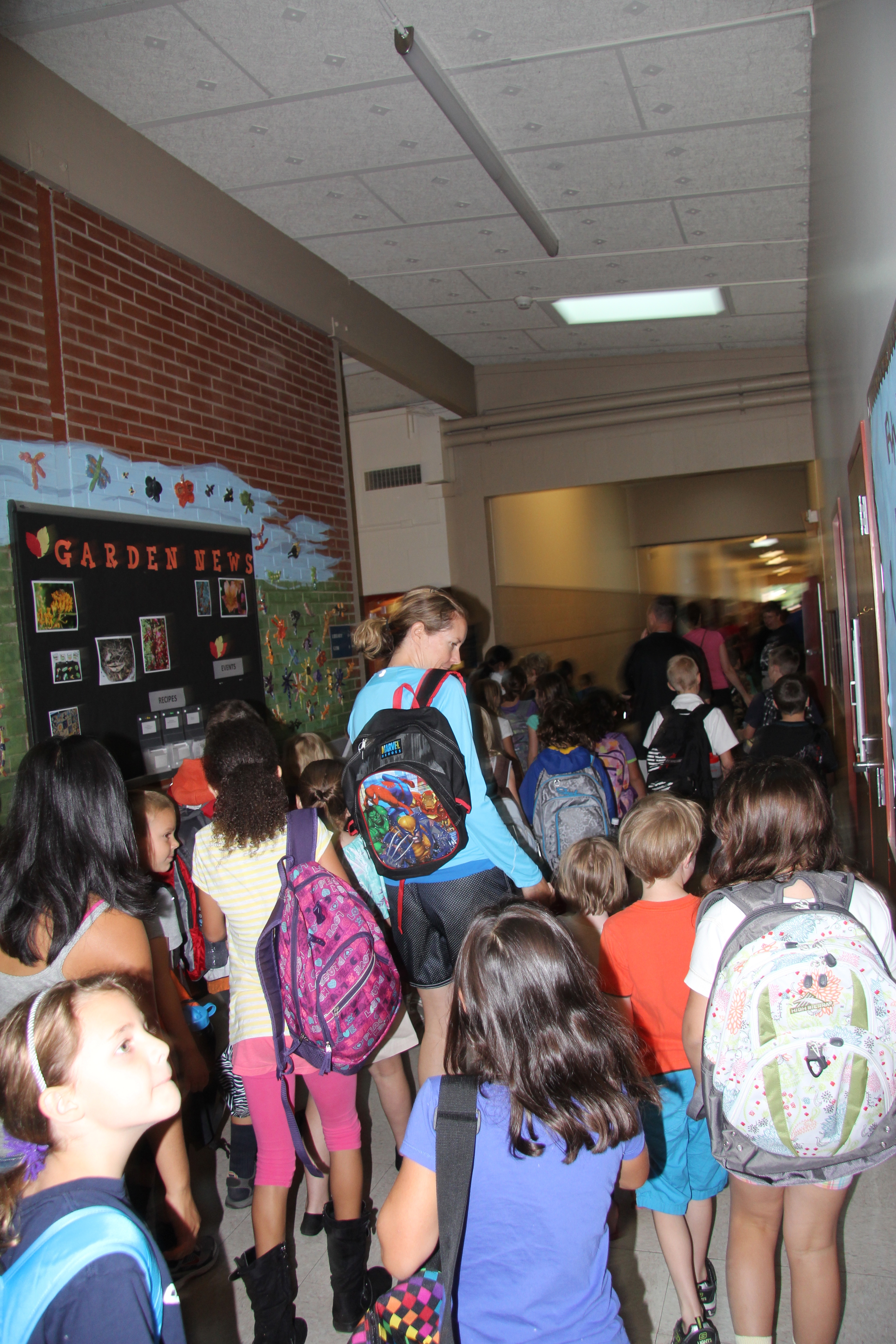 By 8:30 a.m., Jeff, Ian and were parked and headed into school to find his classroom. We were strictly instructed by his teacher that there would be an “open house” from 8:30 to 8:50 a.m. where we could feel free to help our child put away their supplies, lunch and find their cubbies. Then we were to say goodbye and depart. Well, according to my watch, we didn’t even get the full 20 minutes before we heard a kind, but firm, “Okay, parents, you are ‘free’ to start saying goodbye now! We have a very busy day ahead.” I thought about challenging her regarding how busy they could really be on the first day of kindergarten, but on second thought realized that may not be the best way to get off on the right foot with Ian’s teacher. Plus, this lady clearly runs an organized ship and I liked her already. I mean, how long did it take her to do all that labeling in the classroom? Geez. I bet she definitely shops at Michaels!