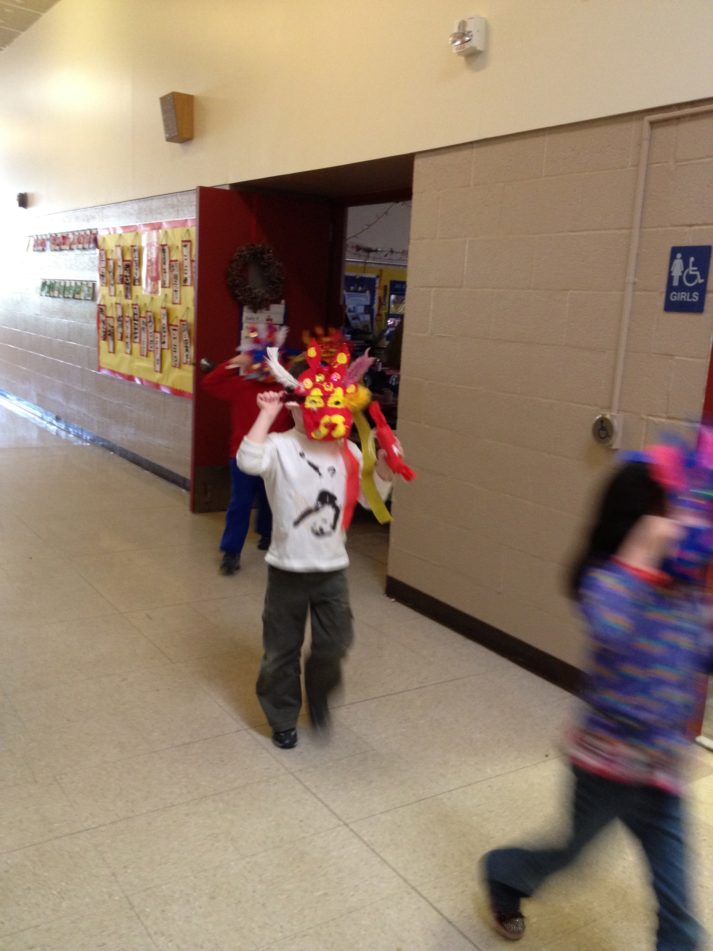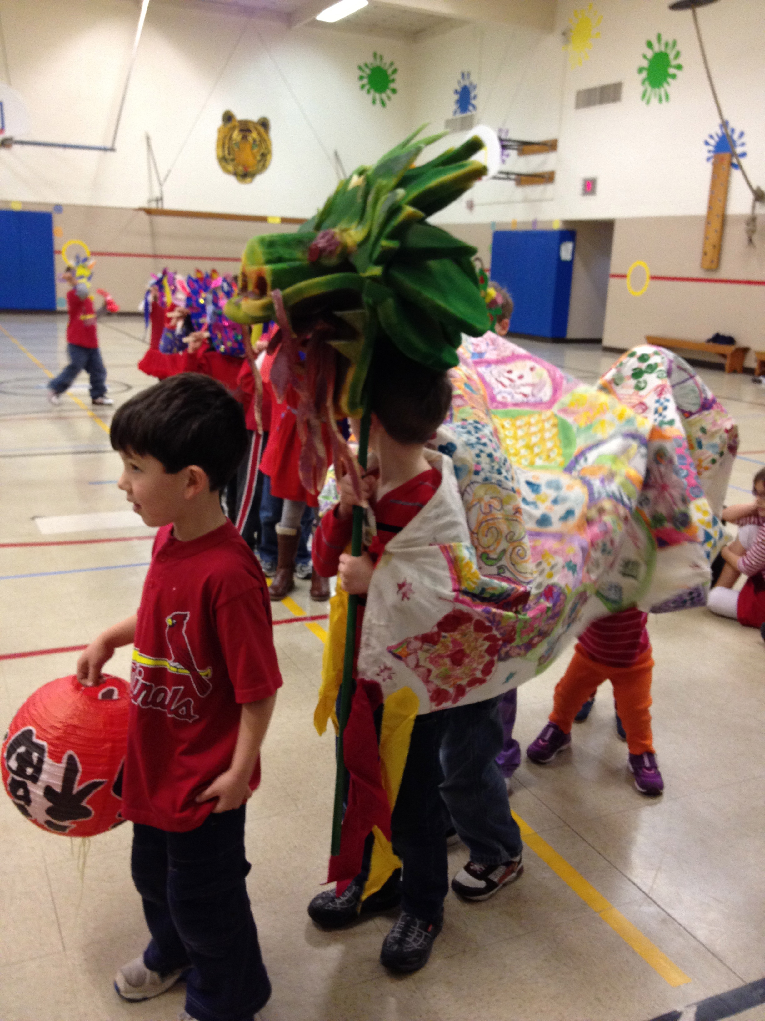 So, Friday was my first volunteer gig – actually for a special event. His class was having a parade through the school to recreate the dragon dance that is part of the lantern festival for Chinese New Year, followed by a little class party with “traditional” Chinese fare: tea, fried rice, a fortune cookie and a piece of mango candy. Some other parents and I helped set up for the party, serve the kids and clean up. Ian was really excited that I was there in his classroom, which alone made the whole thing worth it.